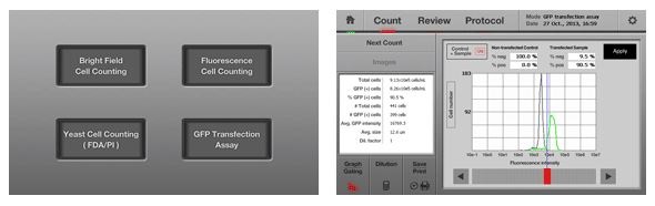 With the LUNA-FL™ Dual Fluorescence Cell Counter, GFP expression analysis takes less than 30 seconds. Bright field and fluorescence cell images are analyzed to detect GFP-positive and negative cells, and a corresponding fluorescence intensity histogram is displayed for further analysis.