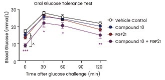 Blood glucose levels were measured during an OGTT performed after 11 days. STZ-induced diabetic male mice were treated by vehicle, compound 10, FGF21 (Sino Biological), or both compound 10 and FGF21.