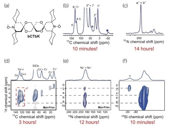 DNP experiments on natural abundance Mat-PrIm: (a) Structure of bCTbK polarizing agent; DNP-enhanced 13C, (b) and 15N (c) 1D spectra and 1H- 13C (d), 1H- 15N (e), 1H-29Si, (f) heteronuclear correlation spectra. 1H DNP signal enhancement = 78 at 100,
