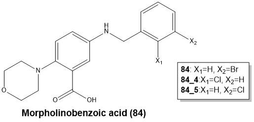 The Amplex Red biochemical assay was used to test the virtual hits. IC50 values were derived for the best hits, and these were verified using the intrinsic tryptophan fluorescence assay (KD). The best hit series was of 2-Morpholinobenzoic acids (84).