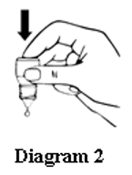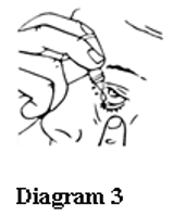 6. Place the dropper tip close to, but not touching, your lower eyelid and gently tap or press the base of the bottle with your forefinger to release one drop (see Diagrams 2 and 3).