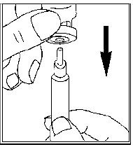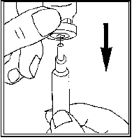 Remove the protective cap from the solvent vial. Attach the needle for reconstitution (the bigger needle) to the syringe and draw up some air into the syringe by pulling the plunger to approximately the 1 mL mark. Then insert the needle into the vial, push the plunger to expel the air, turn the vial upside down and gently draw up all the solvent.