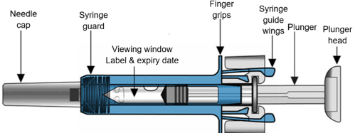 Put the used pre-filled syringe in a sharps disposal container (i.e. a puncture-resistant closable container, or similar) immediately after use.