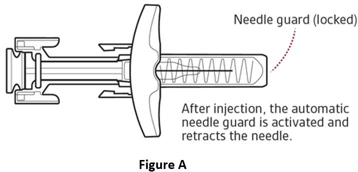 Throw away the used syringe into a sharps container (Figure M) right away.