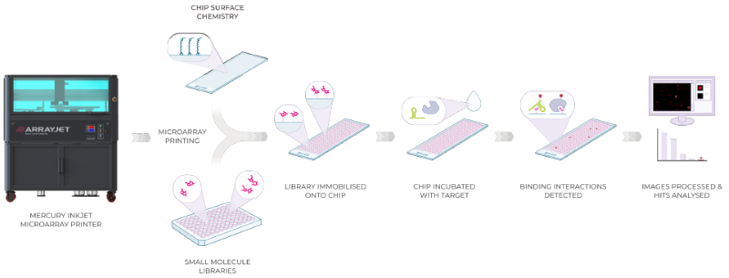 An overview of the Small Molecule Microarray (SMM) process SMM follows a biochemical binding assay protocol. First, the glass chip surface is functionalized, typically with an isocyanate coating, to be highly reactive and allow the immobilization of a diverse range of SMs from a selected compound library. SMM uses unmodified compounds directly from standard library formats and concentrations, typically 10 mM in 100 % DMSO. Through microarray printing using Arrayjet’s Mercury microarrayers each SM in the library is covalently coupled to the chip surface as an individual spot in a spatially resolved microscopic 2D grid. The SMM chip is then incubated with a target of interest, thereby screening for binding against the whole library in parallel. Binding interactions are identified through detection of target molecule fluorescence signal at a discrete spatial position on the microscopic grid. SMM is compatible with various target types including proteins, structural RNA, DNA and cell lysates. Hit identification and quantitative binding data can be generated within 90 minutes