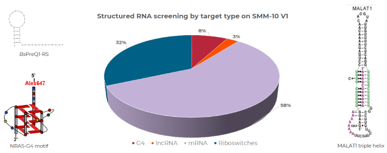 Percentage of SMM-10.V1 chips screened against different RNA target types by Arrayjet in 2025. RNA target types were grouped into four categories: G4 quadruplexes, long non-coding RNA (lncRNA), mRNA riboswitches. Illustrative target structures include bacterial riboswitch Cy5-BsPreQ1-RS, Human 5’UTR NRAS-G4, and MALAT1 triple helix lncRNA fragment