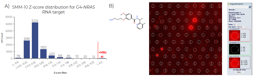 Fig 4. SMM-10 screen identifies novel SM binders for G4-NRAS RNA motif. A) Histogram illustrating the distribution of Z-score values from the SMM-10 screen using G4-NRAS-Cy5 across 10,000 printed small molecules (SMs). Z-scores are plotted along the Y-axis, with the count of SMs on the X-axis. Forty compounds with Z-scores greater than three were considered enriched binders for G4-NRAS. The RNA sequence screened corresponds to the 5′ untranslated region (UTR) of human NRAS mRNA, labelled with Cy5. B) Representative SMM hit image and chemical structure of a selected compound from the G4-NRAS screen. Image captured using Innopsys Mapix 9 software. Image Credit: Image courtesy of Adam Buckle et al., in partnership with ELRIG (UK) Ltd.