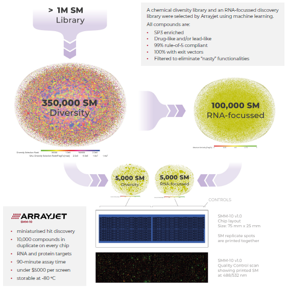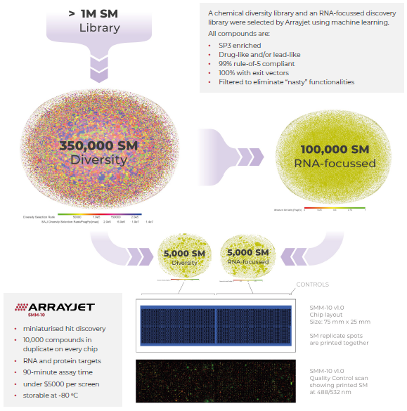 SMM-10 chips are offered ready-to-use, allowing a first exploration of Arrayjet’s 350K+ machine-learning filtered SM libraries.