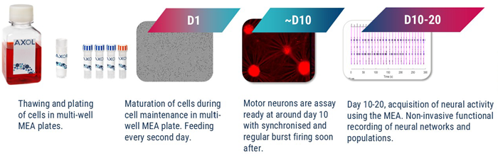 Figure 1. Schematic of protocol from thawing of motor neuron precursors to MEA measurements. Image Credit: Image courtesy of Hannah Sharplin et al., in partnership with ELRIG (UK) Ltd.