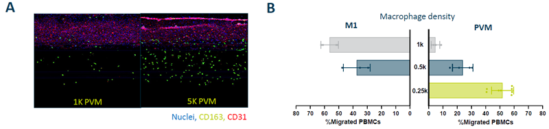 The addition of perivascular macrophages (PVMs) has been shown to have an inhibitory effect on immune cell migration, in contrast to pro-inflammatory M1 macrophages that increased the number of migrated immune cells.
