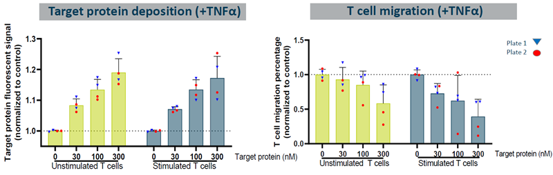 Increased concentration of target protein deposited in the extracellular matrix leads to reduced T cell migration. Effects are more profound with stimulated T cells. Cultures were pre-cultured with TNFα.