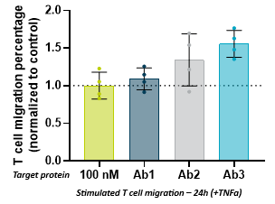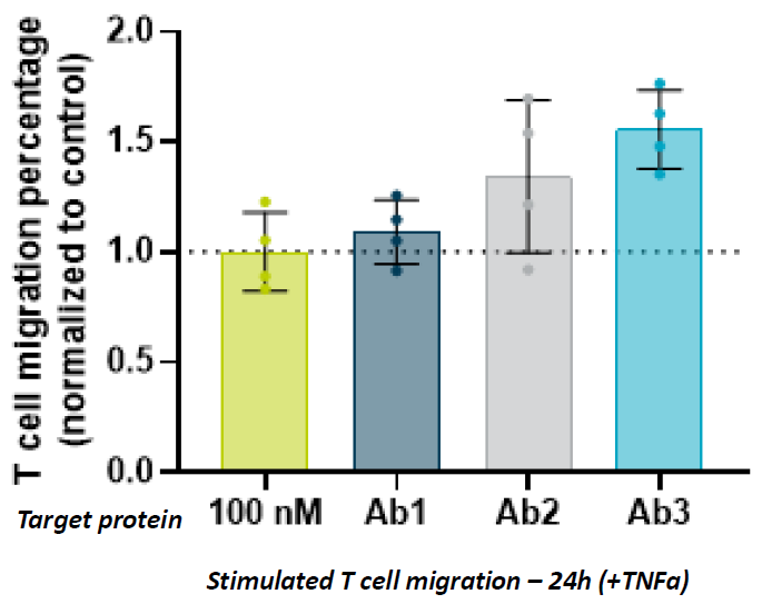 Novel therapeutic antibodies effects were assessed after target protein addition. Ab3 showed an increased migration of T cells.