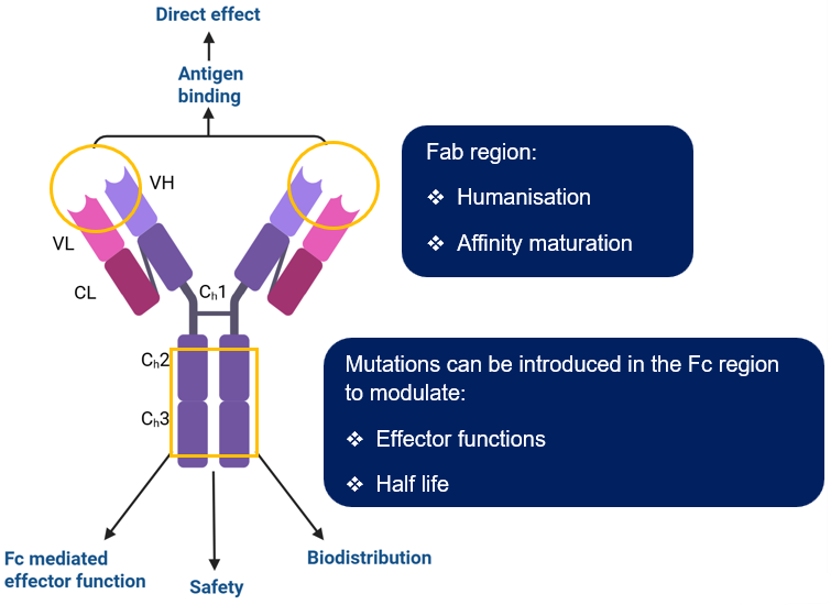 An antibody activates the immune system's cellular and cytoplasmic defence to combat a pathogen. This occurs via interactions of the Fc (CH2-CH3) region to activate three effector function pathways and impacts half-life of antibody (Figure 1). These can be modulated via several Fc mutations to achieve bespoke effects, specific to project needs.