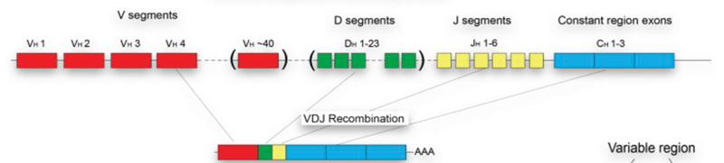 - Genetic recombination of V, D, J, and C regions in T- and B-cells generates millions of different T-cell receptors (TCR) and B-cell receptors (BCR), creating a highly complex “universal response” to almost any pathogen.