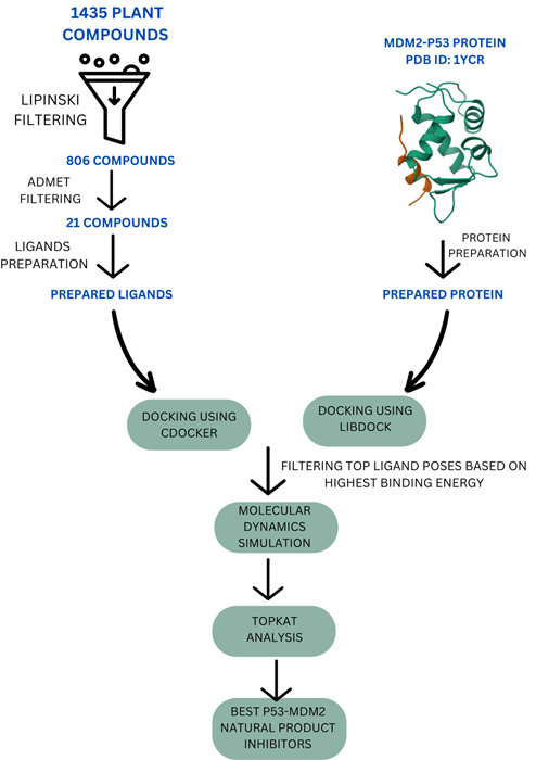 MDM2 overexpression suppresses p53's tumor-suppressive activity by promoting its degradation. This study aimed to identify natural product inhibitors of the p53–MDM2 interaction using computational methods.