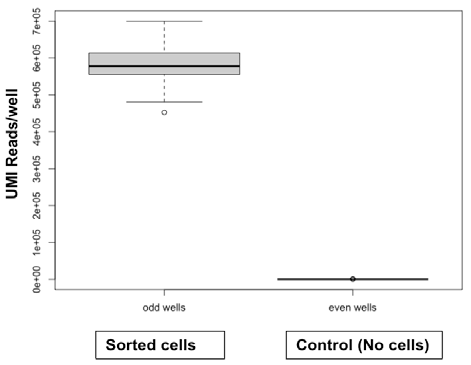 Cross-contamination test between odd wells with sorted cells and control even wells without sorted cells shows no cross-contamination