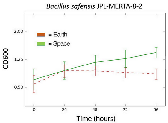 Figure 4. Growth (OD600) over time of Bacillus safensis JPL-MERTA-8-2 in space (green) and on Earth (brown). Image Credit: ELRIG (UK) Ltd.