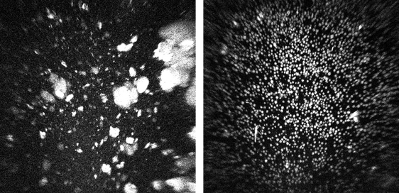 UV imaging of a ground control sample (left) and spaceflight sample (right) from Merck’s investigation, clearly showing the much more uniform size and distribution of crystals grown in microgravity