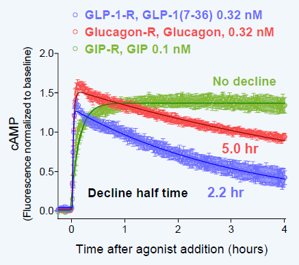 • Different cAMP dynamics for GLP-1, glucagon, and GIP receptors.
