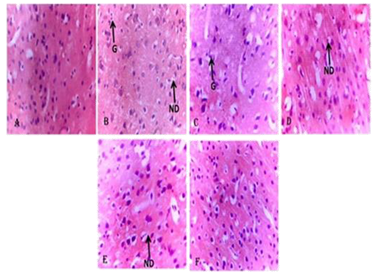 Photomicrograph of the Cortical Sections of the Brain Showing the effect of PMCV002 after Scopolamineinduced Amnesia in Mice. (a). Distilled water group showing normal cortex (b). Scopolamine 1 mg/kg group showing severe gliosis and neuronal degeneration (c). Donepezil 5 mg/kg showing mild gliosis (G) (d). PMCV 002 at 1000 mg/kg showing mild neuronal degeneration (ND) (e). PMCV002 at 500 mg/kg showing mild neuronal degeneration (ND) (f). PMCV 002 at 250 mg/kg showing normal features.