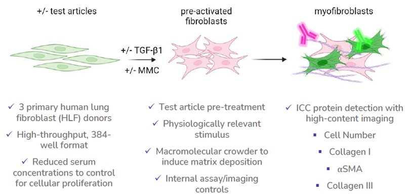 Modeling this process in vitro facilitates the evaluation of potential anti-fibrotic therapeutics for their efficacy in reducing or reversing the fibroblast-to-myofibroblast transition (FMT).