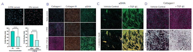 Assay characterization showing the effects of serum concentration and macromolecular crowding agents on cell proliferation and the expression of fibrosis related proteins collagen I, collagen III, and αSMA expression in primary HLF cells with examples of imaging analysis by application of segmentation masks. Image Credit: Newcells Biotech