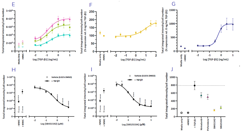 Effects of increasing TGF-β1 concentration on the expression of collagen I (E), collagen III (F) and αSMA (G) expression in normal HLFs. TGF-β1 induced collagen I expression is dose-dependently reduced by ALK5 inhibitors SB431512 and SB525334 (H & I). Physiologically relevant concentrations of Nintedanib (100 nM) and Pirfenidone (100 μM) reduce collagen I expression (J). Image Credit: Newcells Biotech