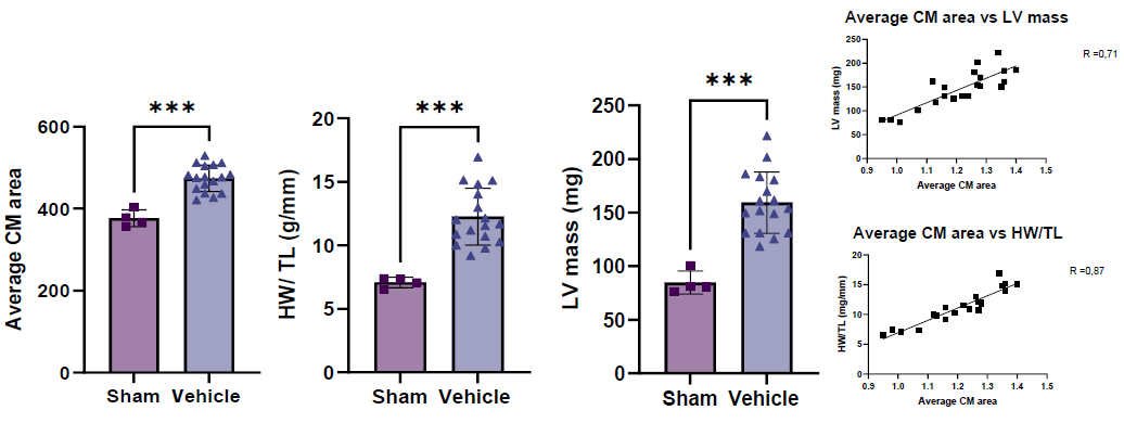 Results. The method was validated in two established rodent models of hypertrophy: the Transverse Aortic Constriction (TAC) mouse model and the Zucker Diabetic Sprague-Dawley Fatty (ZSF1) rat model. In both, AI-based morphometric analysis detected hypertrophy with sensitivity equal to or greater than conventional metrics such as the HW/TL ratio and LV mass, which was cautiously reviewed by a pathologist.