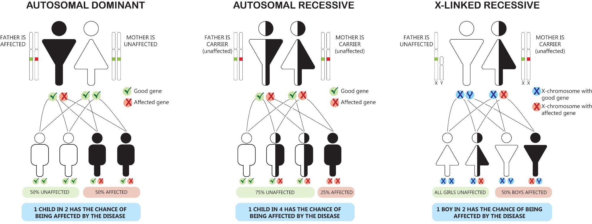 • X-linked recessive: If the father carries the mutation, 100% of his female offspring will carry the mutation, and no male offspring will be affected. However, if the mother carries a similar mutation, there will be a 50% chance that both female and male offspring will express the condition. If both parents have the mutation, 50% of male offspring will have the condition, and 100% of female offspring will inherit the condition. This mutation pattern is responsible for color blindness.