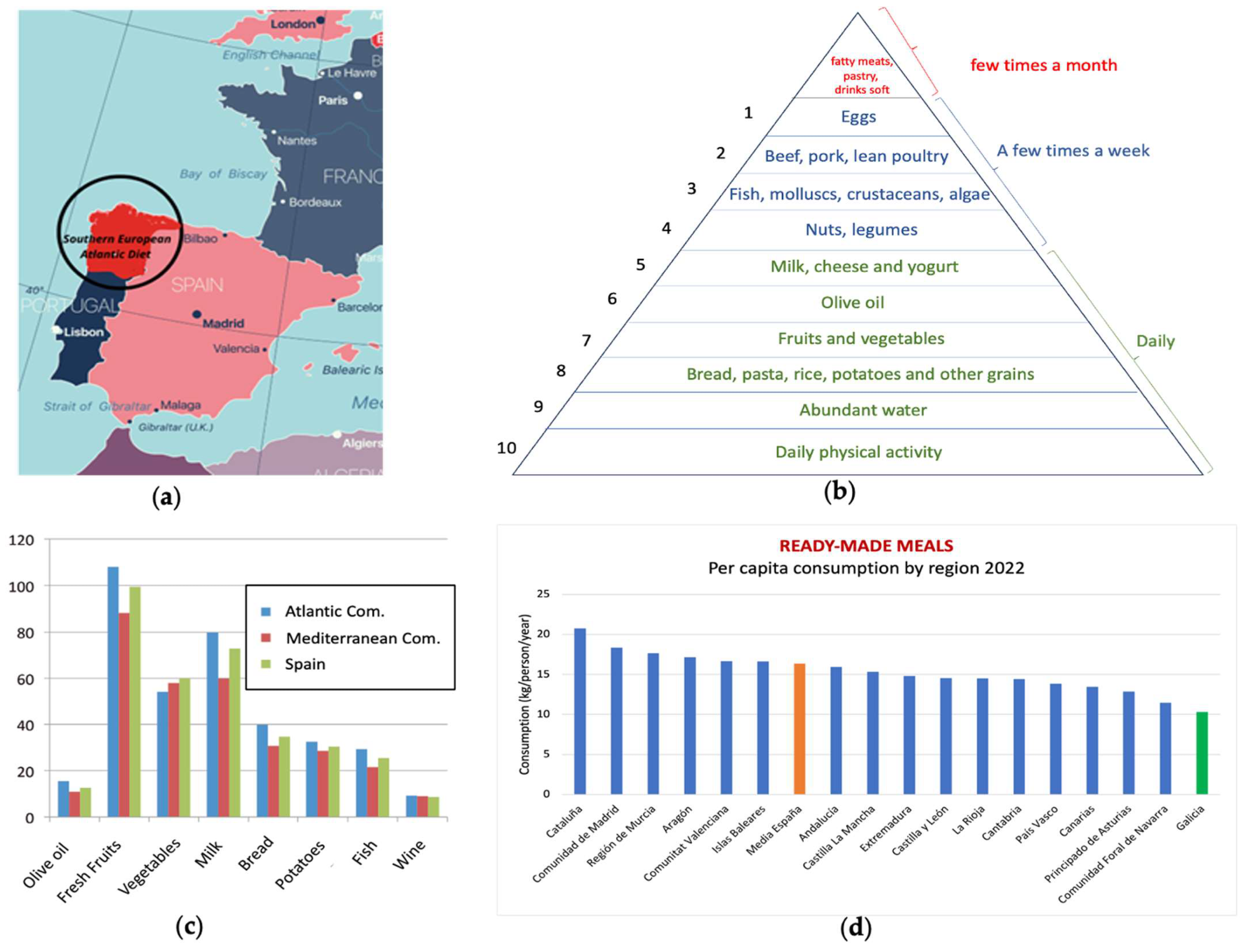 Territorial zone covered by the SEAD; (b) nutritional pyramid of the South European Atlantic Diet (c) comparative consumption of the main beneficial elements of Iberian diets and the whole of Spain (d) consumption of ready-made meals in Spain (by Regions, average of Spain in orange bar, Galicia in green bar): Source: Ministry of Agriculture, Fisheries, and Food, Government of Spain, Food consumption report of Spain, 2022.2