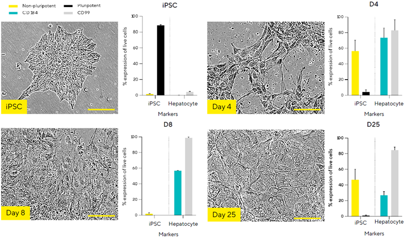 - At Day 25, iPSCs treated with differentiation media have a hepatocyte-like shape, with big polygonal structures and round nuclei with conspicuous nucleoli, rather than the normal colony formation.