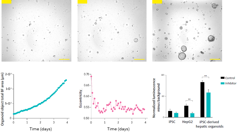 - iPSC-derived hepatic organoids grew quickly, reaching a diameter of 600 µm on day 5.