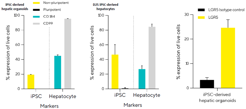 - iPSC-derived hepatic organoids exhibit similar expression profiles to iPSC-derived hepatocytes, including high levels of hepatic marker CD99 and expression of CD184.