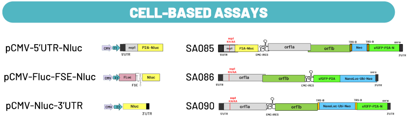 Cell-based assay: To identify binders to RNA structures that are critical for viral replication, a panel of constructs was created. Specific viral regions, the 5'UTR and 3'UTR, were selected as involved in the discontinuous transcription process, along with unrelated RNA structures (i.e. the Frameshift Element, FSE), and were fused with a reporter gene to identify molecules that alter their functionality in cells specifically. The modified replicons were designed to discriminate for a specific mechanism of genome replication.