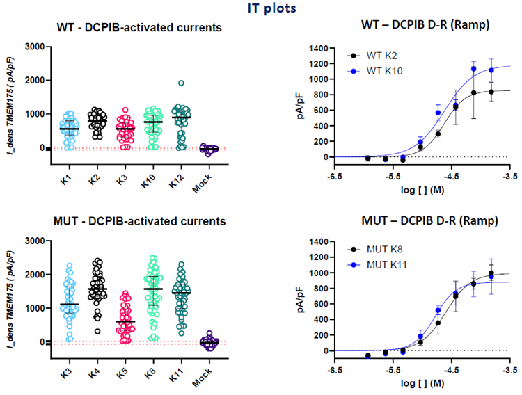 - Stable cell lines expressing wild-type (WT) and mutated TMEM175 were successfully selected using a thallium fluorescence assay and further characterized electrophysiologically. All tested clones exhibited consistent responses to the TMEM175 activator DCPIB, acidic pH, and were effectively blocked by 4-AP, with a high success rate for catch, seal, and expression.