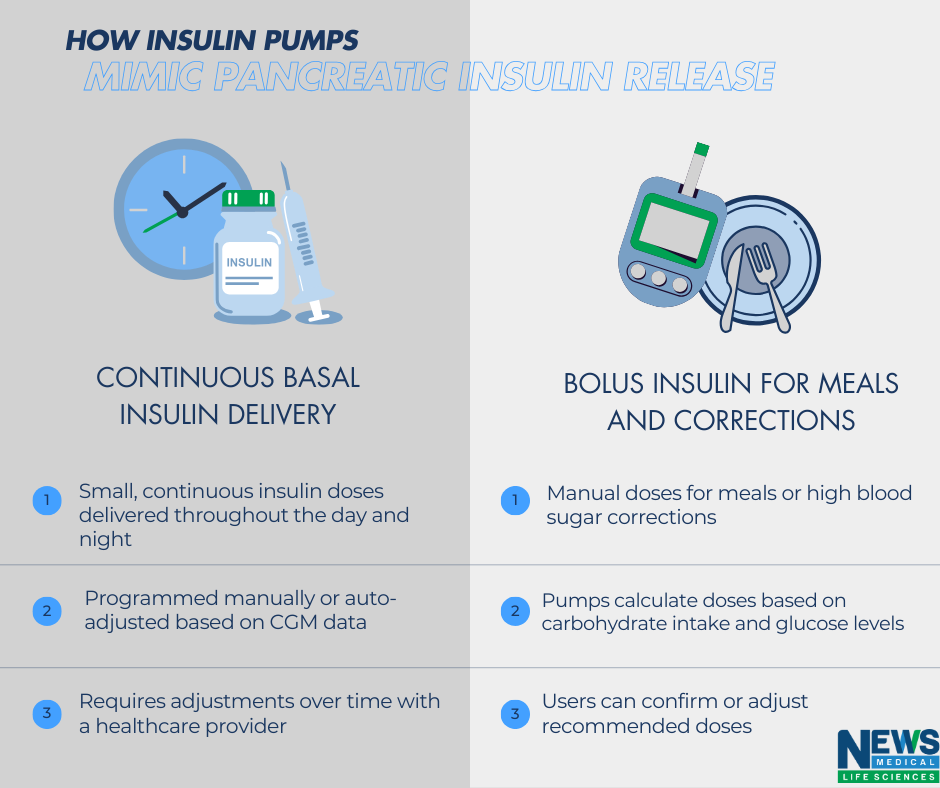 Infographic illustrating how insulin pumps mimic pancreatic insulin release