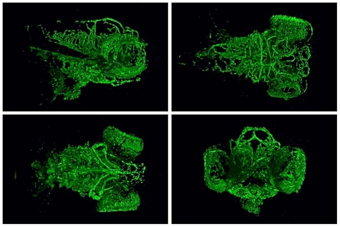 Image:5-day-old zebrafish heads showing development of blood vessels within the brain and eye. Author: NICHD/ /M. Butler/ flickr.com. Shared under license.