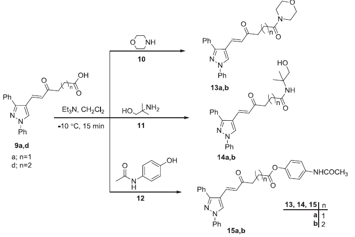 Preparation of pyrazole amides 13a,b, 14a,b and pyrazole esters 15a,b.