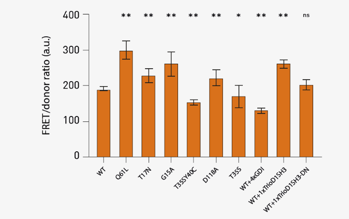 The results in Figure 3 were in line with the expectations for mutations and co-transfections. Of note, the Q61L exhibited a significant increase in FRET, which agrees with this being the strongest activating mutation of Rac1. Three dominant negative mutants (T17N, G15A, and D118A) exhibited a moderate increase in FRET signal, suggesting that stable interaction with upstream activators enhances FRET.