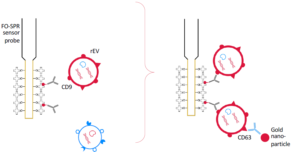 Figure 1. Real time detection. Fiber optic surface plasmon resonance (FO-SPR) dip-in probes in 96 well plates on WHITE FOx, functionalized with EV biomarker specific primary antibodies are used to bind rEVs spiked in buffer samples by anti-CD9 for calibration, or bind breast cancer specific EV with anti-EpCAM from complex liquid samples as blood plasma: MCF7-EV spiked for assay development, and human volunteer samples versus a spiked plasma control for proof of concept. As signal amplification to overcome label free detection limits, a sandwich assay was applied with anti-CD63. With subsequent sandwich additions, this may allow for multiplexing of a limited number of biomarkers.