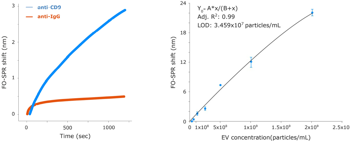 FO-SPR provides a unique opportunity to detect EVs directly in complex matrices with minimal processing, thanks to its dip-in configuration. Here, we describe a FO-SPR assay capable of detecting EVs with LODs 103 times lower than the expected physiological concentration of EVs in healthy human plasma and 104 times lower than EV concentration in the plasma of cancer patients (3). FO-SPR, therefore, has great potential for sensitive EV analysis, particularly for analyzing EV subpopulations with specific biomarkers, which are typically at a much lower concentration in patient samples.