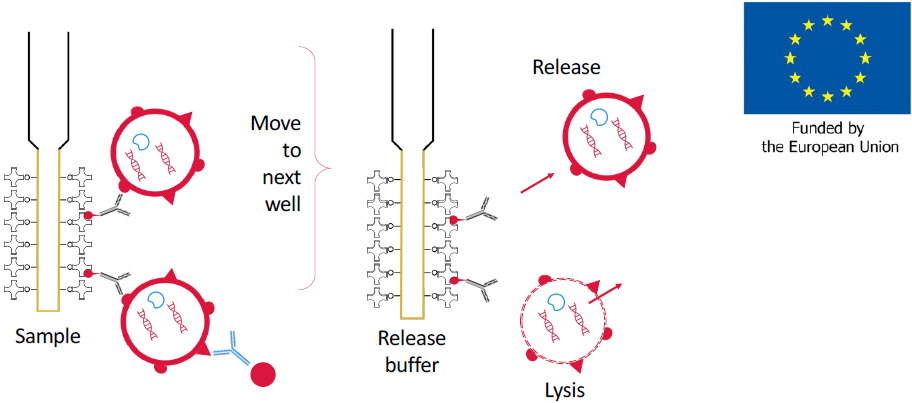 Figure 4. Development of automated isolation procedure. The captured EVs can be transferred to a well with release buffer to dissociate the EV from the probe, or to wells with lysis buffer to release their content for further analysis of their membrane proteins, cytoplasmic proteins, RNA, DNA and metabolites. This is supported with an EIC accelerator grant (*) to develop EV affinity FO-SPR sensor probes and analytical procedures for isolation and detection of biomarkers. The combined methodology aims to detect, quantify, isolate and characterize EVs for the early and specific diagnosis of disease markers direct from liquid biopsies such as blood. Adapted from FOx-EV EIC accelerator grant (*)