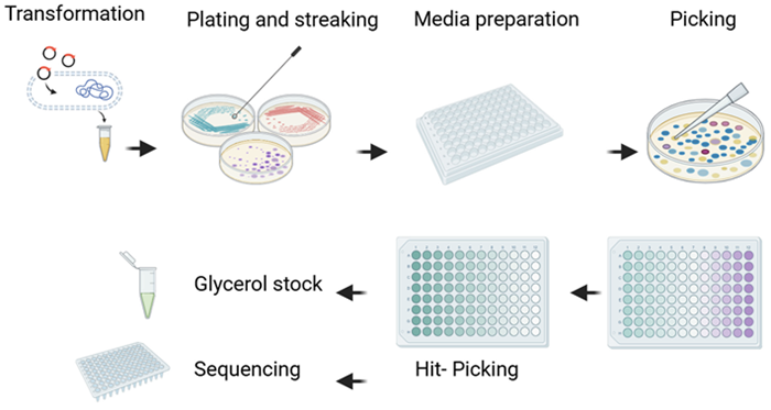 Colonies are picked based on specific traits such as color, with hit picking used to identify positive clones for sequencing. Glycerol stocks are also prepared for long-term storage.