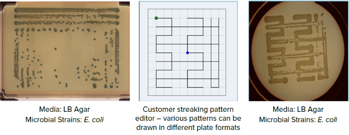 The image above (left) shows DH5α E. coli expressing β-galactosidase. This has been streaked on LB agar containing 100 μg/mL ampicillin. This example highlights the instrument’s capacity to dip and streak without bacterial concentration dilutions.