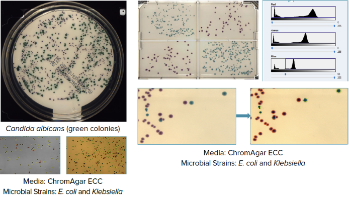 RGB gradient analysis enabled accurate species differentiation on selective media such as CHROMagar™ Candida and CHROMagar™ ECC, with 100% accuracy. These capabilities support efficient color-based colony picking and morphological analysis.