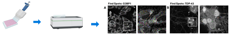 Figure 1. Quantitative imaging protocol for interrogation of stress response pathways. U-2 OS cells and iPSC-derived motor neurons were plated on 96-well plates and incubated with inducers of cell stress. Cells were subject to immunocytochemistry and imaged using an Opera Phenix High Content Screening System. (A) U-2 OS cells immunolabelled for G3BP1 and (B) iPSC-derived motor neurons immunolabelled for TDP-43 (Scale bar = 100 uM). Spot detection software identifies and quantifies G3BP1 and TDP-43 spots. Created in https://BioRender.com. Image Credit: Image courtesy of Daisy Maiden et al., in partnership with ELRIG (UK) Ltd.