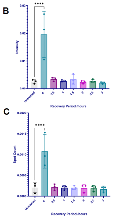 Figure 3. Sorbitol SG disassembly dynamics in U-2 OS cells. (A) U-2 OS cells were treated with sorbitol (400 mM, 1 hour), after which the media was replaced to return cells to basal conditions for 0.5 – 3 hours. Cells were immunolabelled with G3BP1 (green) and dyed with Hoechst (blue) and CellMask (red) (scale bar = 100 μM). Stress granules were induced and subsequently disassembled within 0.5 hours of sorbitol removal. This is shown in quantification of (B) relative G3BP1 spot intensity, (C) average number of G3BP1 spots per cytoplasm area, and cytoplasmic G3BP1 spot area (not shown). Statistical analysis: one-way ANOVA with Dunnett’s multiple comparisons test (**** = p< 0.0001). Image Credit: Image courtesy of Daisy Maiden et al., in partnership with ELRIG (UK) Ltd.