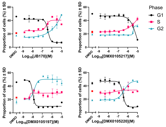 • Data shows JB170 and our novel PROTACs trigger cell cycle arrest in G2 phase in a concentration-dependent manner.