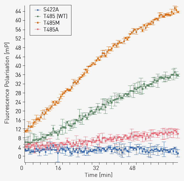 Fig 2. BOCILLIN fluorescence polarization over time with WT, S422A, T485A, and T485M PBP5 variants. Image Credit: Image courtesy of Molly Jackson et al., in partnership with ELRIG (UK) Ltd.