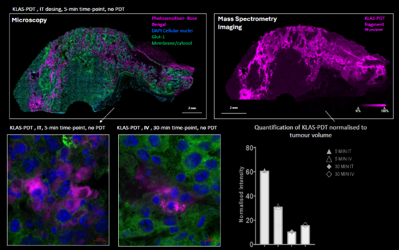To assess the in situ biodistribution of KLAS-PDT, MDC developed a workflow that integrated MSI and fluorescence microscopy for the identification of KLAS-PDT in preclinical models of melanoma. An algorithm developed during the data processing step enabled data integration, identification, and quantification of the KLAS-PDT therapeutic. Accumulation of KT-001 was observed from the five-minute time point using both IT and IV route.